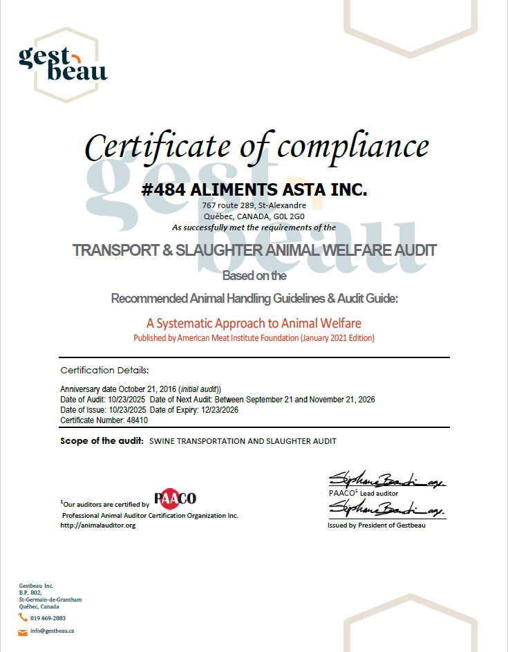Since November 2014, Aliments ASTA has been holding a certification of recognition of the standards of the Recommended Animal Handling Guidelines and Animal Welfare Audit Guide of the North American Meat Institute. An accredited expert of the Professional Animal Auditor Certification Organization (PAACO) conducted the audit.